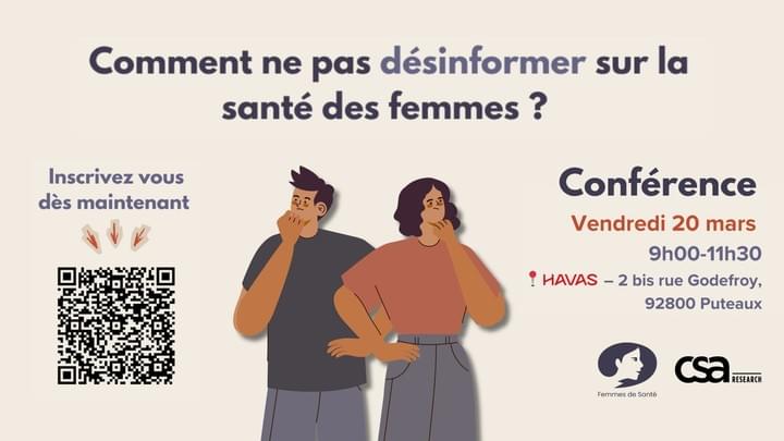 Rendez-vous le 20 mars à 9h00 pour une conférence Femmes de Santé, organisée en partenariat avec L'Institut d'étude CSA : "Comment ne pas désinformer sur la santé des femmes ?"
